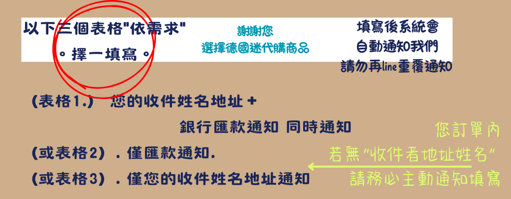 inv 委託本網代購者-匯款/地址-通知表格 (代收集運者 ”勿“使用此頁) 1. INV 收貨人資料+銀行匯款通知同意- 遇退費會扣除銀行轉帳手續費 *是的 !我理解,遇退費會扣除銀行轉帳手續費(當您委託我們幫您代購商品也=支付處理您訂單的時間跟精力,不接受缺退抱怨收此費用-造成您的不便,敬請見諒 有疑問請先客服 以避免爭議) 勿再使用 Line, FB 等社交軟體等通知 /勿重複填寫 /我們為國外網站,無法即時對帳,非24小時人工對帳,至少兩個工作天完成對帳並請勿催促!幫助我們節省客服人力時間,專注您的訂購出貨,才能早日到貨 INV訂單號碼 *請務必審慎評估, 本網保留訂單接受與否權利- 若因交易條件有誤或有其他情形導致本網無法接受您的訂單,將以email發送無法出貨通知給您匯款金額匯款帳號後五碼匯款日備註有特別補充本網還需注意的事項...等 (如:ezway 註冊的/人名/手機/身分證)收件者資料 (台灣包稅運請填中文) ;使用Fedex/dhl 請提供英文 /若不確定哪種貨運則中英文 若訂單上已經有顯示,請填寫"0" *ZIP / Postal CodeEZ way實名認證 -使用包稅貨運(必須提供) * *Email Address若您要收到“本表格副本”請填寫確認送出 ~ (勿重覆填寫/勿再使用line/fb通知) 2. INV銀行匯款通知同意- 遇退費會扣除銀行轉帳手續費 *是的 !我理解,遇退費會扣除銀行轉帳手續費(當您委託我們幫您代購商品也=支付處理您訂單的時間跟精力,不接受缺退抱怨收此費用-造成您的不便,敬請見諒 有疑問請先客服 以避免爭議) 勿再使用 Line, FB 等社交軟體等通知 /勿重複填寫 /我們為國外網站,無法即時對帳,非24小時人工對帳,至少兩個工作天完成對帳並請勿催促!幫助我們節省客服人力時間,專注您的訂購出貨,才能早日到貨 INV訂單號碼 *請務必審慎評估, 本網保留訂單接受與否權利- 若因交易條件有誤或有其他情形導致本網無法接受您的訂單,將以email發送無法出貨通知給您匯款金額匯款帳號後五碼匯款日備註有特別補充本網還需注意的事項...等 (如:ezway 註冊的/人名/手機/身分證)Email Address若您要收到“本表格副本”請填寫確認送出 ~ (勿重覆填寫/勿再使用line/fb通知) 3. INV 請提供收件者資料若您選用德國台灣包稅運請填中文/若您使用fedex/dhl 請提供英文inv 訂單號碼 *Name *Phone Number *收件者地址 *務必填寫(鄉/鎮/市/區+郵遞區號)ZIP / Postal Code *務必填寫EZ way實名認證 -使用包稅貨運(必須提供) *若非使用包稅運者,請填寫" 0"/中文姓名/電話若同收貨人僅需填寫身分證號Submit 送出