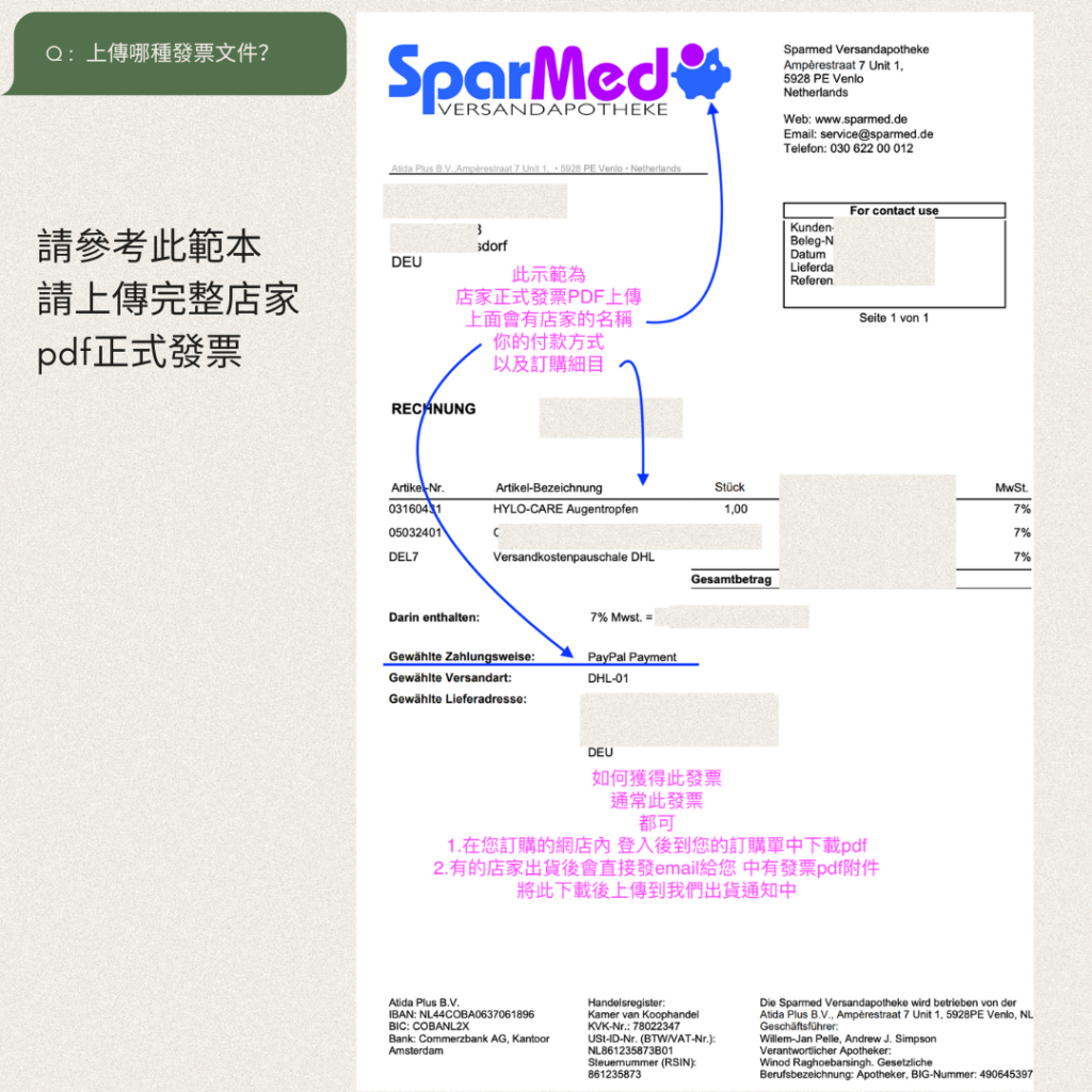 test 第1頁-常問與答 第2頁-包裹未到倉可出貨? 第3頁-上傳哪種文件發票? 第4頁-包裹未到貨? 第5頁-包裹遺失 包稅運說明 代收包裹文件補充上傳 包裹認領 代收地址填寫說明 我的代收號碼/新增包裹/出貨通知 我的包裹管理/匯款通知 發出貨通知時,請上傳你購買此包裹得已付款發票證明(如下pdf格式) 文件要求: 請上傳完整店家 PDF 正式發票。 發票內容: 範本展示的發票上包含店家的名稱、付款方式及訂購細目(如 HYLO-CARE 眼藥水、運費等)。 獲取方式: 登入訂購的網店,從訂購單中下載 PDF 檔案. 檢查出貨通知電子郵件,店家有時會將發票 PDF 作為附件發送.